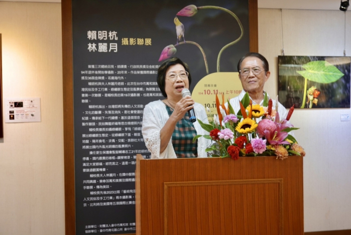 林麗月老師感謝親朋好友蒞臨,也謝謝賴校長牽她的手,一直給她鼓勵與勇氣。她透露賴校長展出的作品,都是挑選最好的角度。這次她展出15件作品,請大家指教。