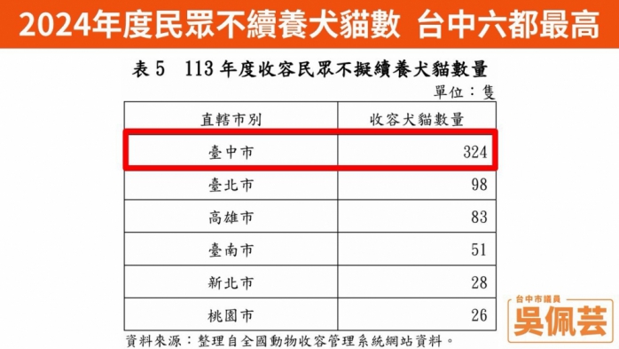 市議員吳佩芸首先根據「2024年度臺中市總決算暨附屬單位決算及綜計表審核報告」引用的統計資料表示,臺中市在2024年度不擬續養犬貓的數量是六都最高,高達324隻,與第二名的臺北市相比,甚至高出3.3倍。這樣的數字非常驚人,也代表市府在「飼主責任」與「源頭管理」這一塊,恐怕還有相當大的改善空間。