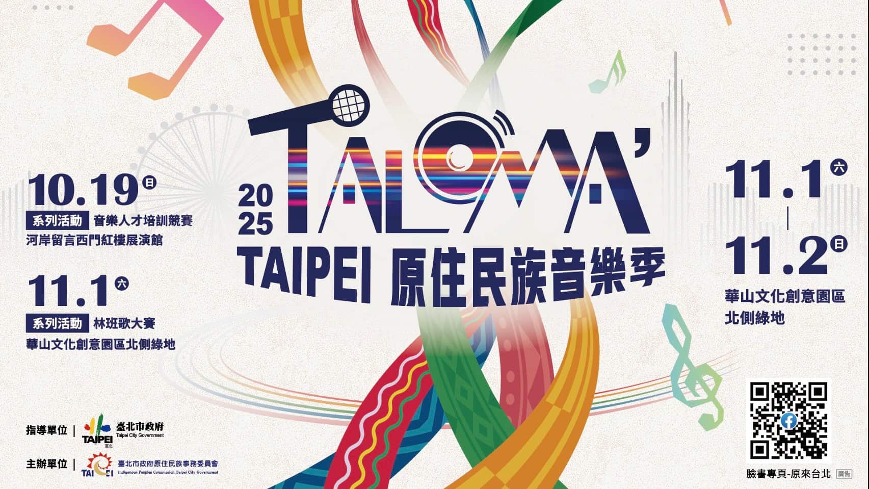 「2025 TALOMA’ Taipei 原住民族音樂季」將於11月1日(六)至11月2日(日)在華山1914文化創意園區北側綠地盛大開唱,活動包含音樂演出、市集、成果展與林班歌大賽,阿爆、Boxing、舞炯恩、舞思愛、VERA 等眾多卡司輪番登場,民眾可至「TALOMA’ Taipei 原住民族音樂季」臉書粉絲專頁查詢最新資訊,一起感受原音不止、城市共鳴的節奏力量。