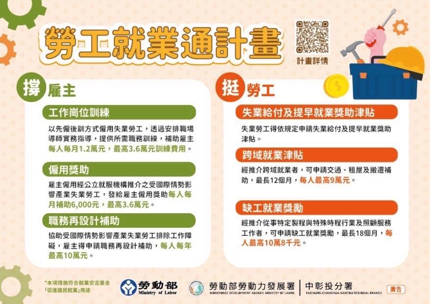 中彰投分署表示,「勞工就業通計畫」以「撐企業、挺勞工」為核心精神,針對自114年3月30日起,原任職公司屬於受國際情勢影響的金屬製品製造業、機械設備製造業、電子零組件製造業等業別,且失業期間連續達30日以上的勞工,由各公立就業服務機構整合運用僱用獎助、工作崗位訓練補助及職務再設計等三大資源,透過媒合機制協助人力對接合適企業,促使雇主願意穩定僱用、勞工順利重返職場。