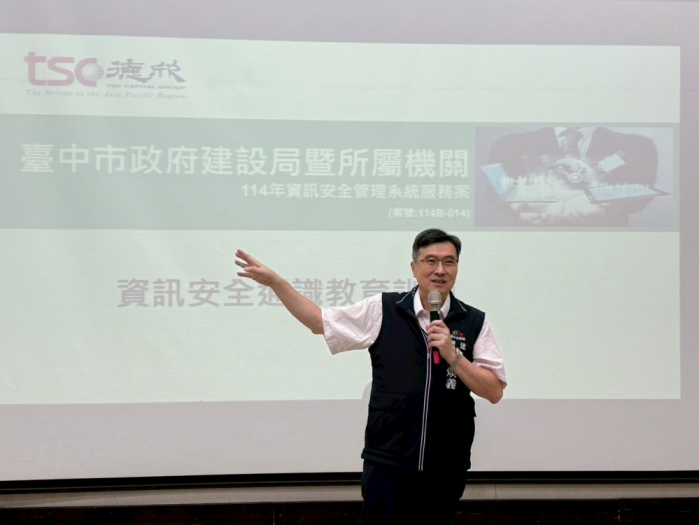 台中市政府建設局22日舉辦「114年度資通安全教育訓練」,建設局由副局長顏煥義代表陳大田局長至現場致詞勉勵同仁,期待透過邀請專家講授分享實務資安課程,以提升同仁資訊安全意識與實務操作能力。