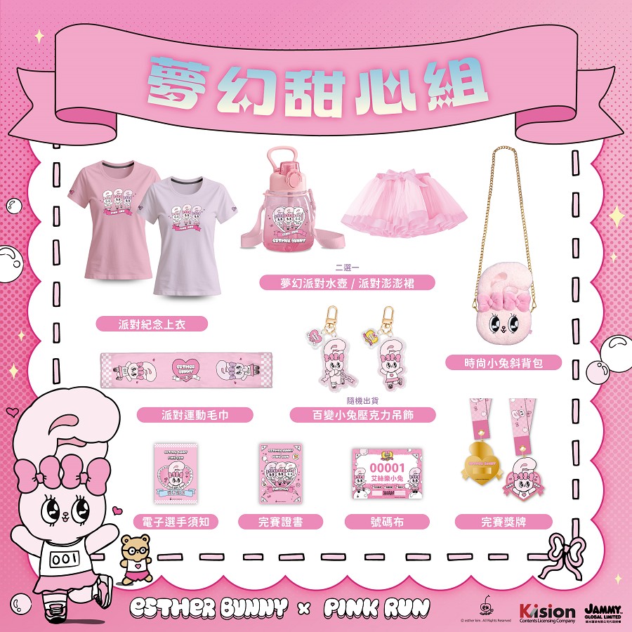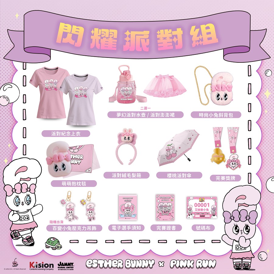 參賽者報名即獲得「路跑限定」物資組合,內容包括派對紀念上衣、時尚小兔斜背包、夢幻派對水壺/派對澎澎裙(二擇一)與限定款完賽獎牌,讓每位跑者都能把最萌回憶收藏回家。