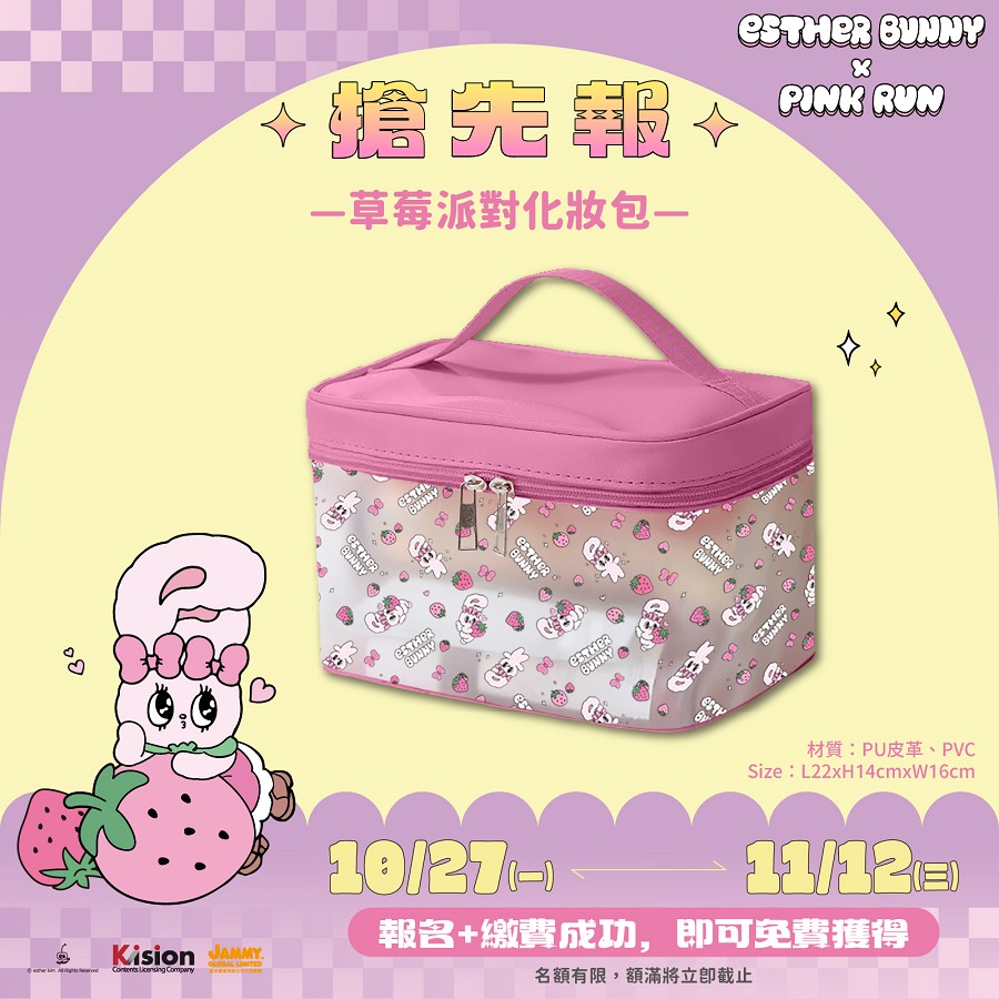 10/27 起至 11/12 止搶先報名,並完成繳費者,即可免費獲得「草莓派對化妝包」乙個,粉嫩透明款搭配角色造型,實用又好拍,絕對是女孩們夢幻化妝包首選!