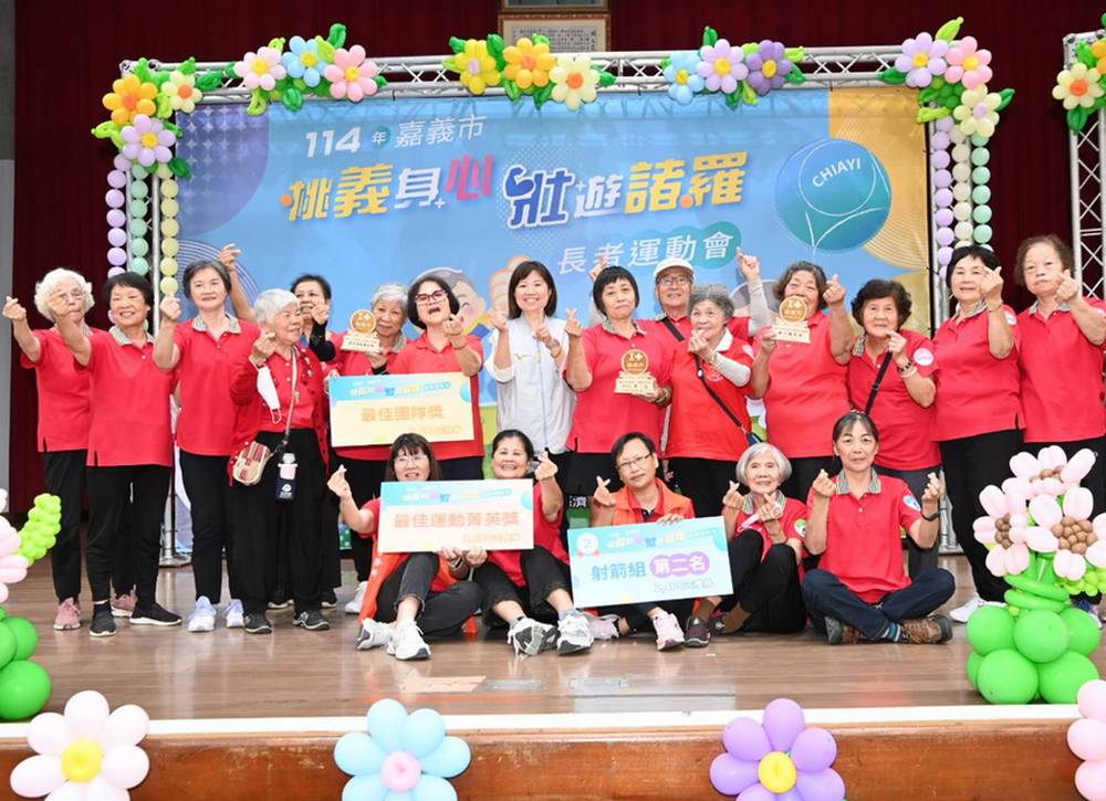 (記者任芳葵嘉義報導)嘉義市首屆「桃義身心‧壯遊諸羅-長者運動會」30日熱鬧登場,有20處巷弄長照站總計320位長輩及據點人員共襄盛舉,嘉義市醫事C巷弄長照站參加率達100%,更有5位90歲長輩,黃敏惠市長特地致贈呷百二紅包,勉勵大家能健健康康活到120歲。