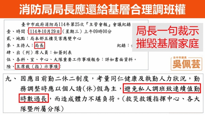 吳佩芸再次強調,調班是消防員的權力,不是機關長官給的福利,市府需正視消防員的家庭與需求,而非以行政命令犧牲他們的家庭幸福。
