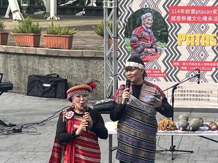 【記者胡永承台北報導】紋面Prada家族感恩祭文化傳承活動,22日於台北巿議會前舉行,由中視資深女歌星徐錚錚主持,原族民委會主委巴干干萬及立法委員伍麗華助理卡伊、馬賴。盧縣一.台北市議員李芳儒,李傅中武國民黨部烏來主任委員何應明到場,並有世界美顏小姐36位蒞臨與會。