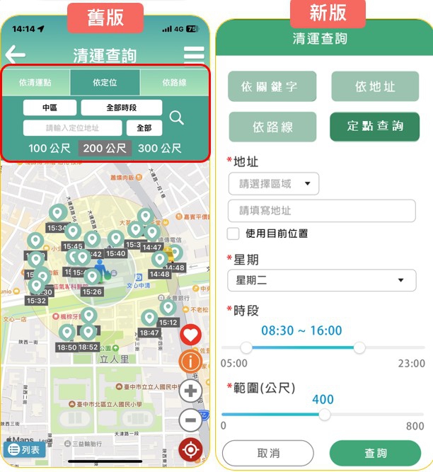 在設計方面,此次改版著重「介面簡潔」與「操作流暢」,保留使用者熟悉的操作邏輯,降低重新學習負擔。新版介面導入清新明亮的視覺風格與色調,功能分類清楚易懂,地圖資訊視窗移至畫面下方,讓使用者可同時瀏覽地圖與內容,整體操作體驗更加直覺便利,展現市府推動智慧環保、提升民眾服務品質的用心。
