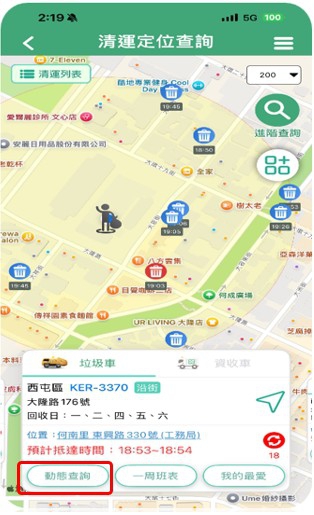 環保局說明,此次APP全新改版,讓市民查詢垃圾清運資訊更加即時、便利。其中「動態清運查詢」功能如同公車預計到站資訊,市民可針對指定清運路線及車輛,即時查詢清運進度與到站點位。
