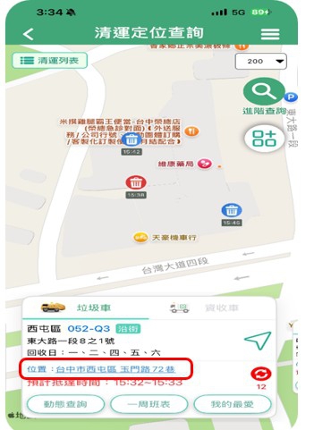 另外也新增「定點查詢」功能,可快速瀏覽各行政區平日定點服務位置與時間,並能過濾出符合民眾定點資訊,方便上班族與通勤族依個人作息彈性選用安排清運垃圾時間。同時新增「車輛追蹤」功能,市民可將常用或關注的清潔車加入追蹤列表,隨時掌握車輛出勤與即時位置資訊,提升清運資訊掌握與便利性。