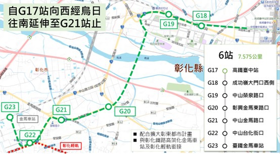 南向「彰化延伸段」以高鐵台中站(G17)為起點,沿烏日高鐵特定區往彰化市延伸,並銜接彰化鐵路高架化後的新設金馬站,長度約7.575公里,將增設6座高架車站。