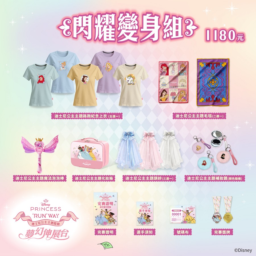 參加者可依喜好選擇「閃耀變身組」或「夢幻加冕組」報名,所有組別皆含迪士尼公主主題路跑限定物資與完賽證明、獎牌。閃耀變身組含:公主頭紗、化妝箱、毛毯、泡泡棒與補妝鏡;夢幻加冕組則有白雪公主斗篷、抱枕毯與完整進階物資,讓你從起跑到終點,全程夢幻、信心滿滿!