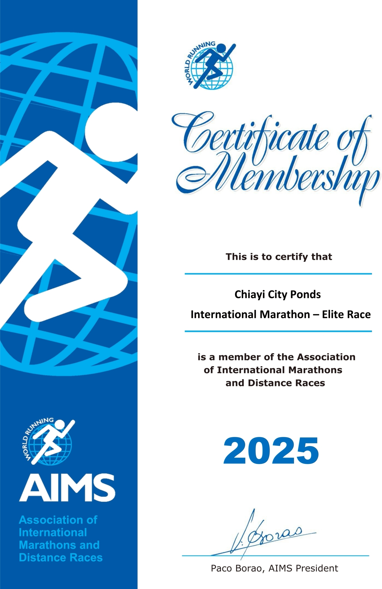 「2025嘉義雙潭馬拉松菁英賽」賽道通過 國際馬拉松暨公路跑協會(AIMS)認證,正式成為會員賽事。AIMS 認證賽道採精密科學丈量,使跑者完賽成績具備國際效力,並可被世界級紀錄正式承認。台灣獲得 AIMS 認證的賽事相對稀少,本屆賽事更同步登上 AIMS 國際馬拉松暨公路跑協會季刊 《Distance Running》,象徵嘉義市與國際跑界正式接軌、躍升全球矚目的城市級運動品牌。