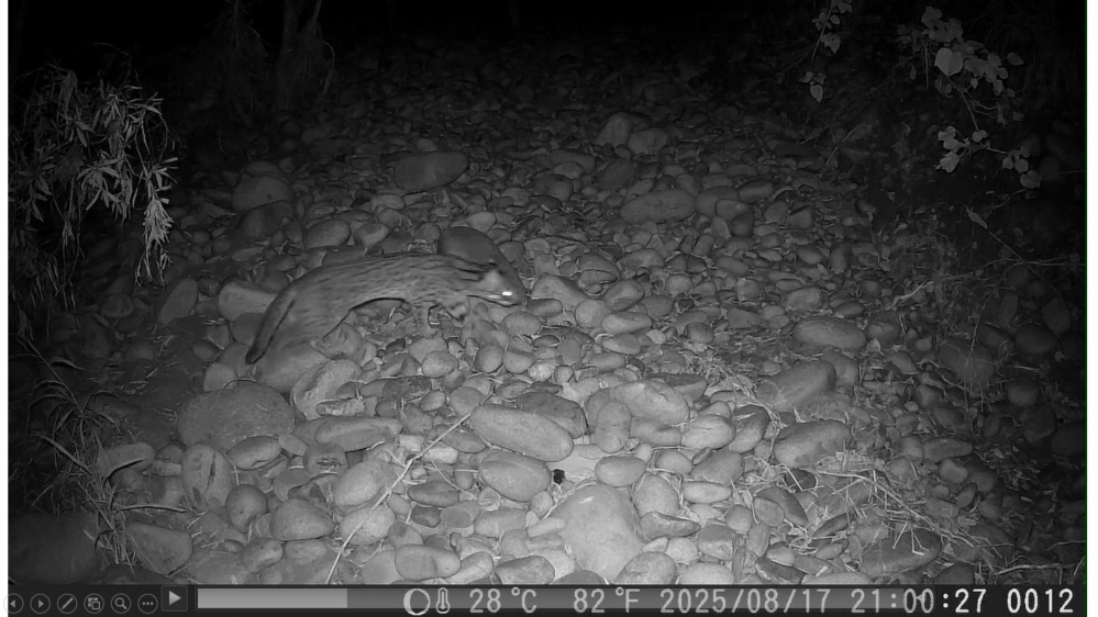 林業保育署臺中分署指出,114年8月間,設置於鹿寮南溪的自動相機驚喜拍攝到一隻健康石虎的身影,這不僅是當地二十年來首度記錄到石虎再現,也成為國土生態綠網串連淺山物種棲地的重要里程碑。除了石虎外,自動相機也同步記錄到白鼻心、赤腹松鼠與環頸雉等野生動物活動,顯示當地棲地環境已恢復,生態系功能逐步健全,展現出復育工作的成效。