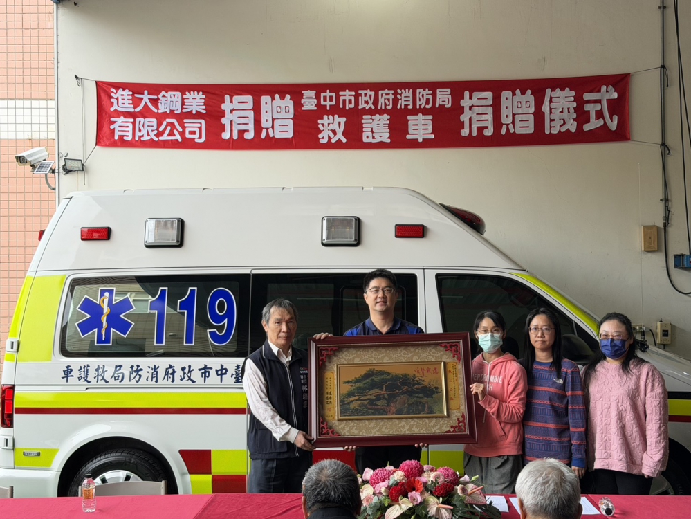 【記者林獻元台中報導】進大鋼業有限公司秉持「取之於社會、用之於社會」的企業理念,長期投入公益關懷,為強化台中市第一線緊急救護量能,捐贈一輛全新救護車及多項救護設備予台中市政府消防局,希望能提升救護裝備、縮短救護反應時間,進一步保障市民生命安全。