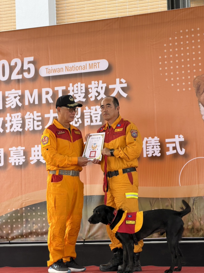 【記者林獻元台中報導】台中市政府消防局搜救犬隊再次寫下光榮紀錄!領犬員洪瑞宏與搜救犬Uno、領犬員張憲騰與搜救犬Ring兩組搭檔,在日前由內政部消防署於竹山訓練中心舉辦的「2025年國家MRT(Mission Readiness Test) 搜救犬救援能力認證活動」中,雙雙順利通過認證。這項被譽為全台最高等級、最貼近真實災害場景的搜救犬檢測,不僅驗證台中搜救犬隊的專業實力,更展現他們將是未來國際人道搜救領域中不可或缺的關鍵力量。