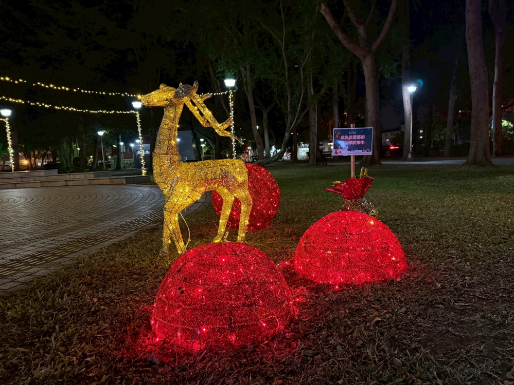 建設局長陳大田表示,為歡慶聖誕節及歲末迎新,特別規劃於市區公園設置節慶燈景,其中豐富公園於入口廣場打造可愛亮眼的聖誕樹造景,聖誕老人與馴鹿環繞其間,帶來滿滿祝福。