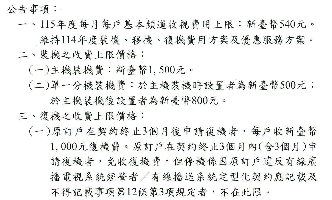 確認兩家系統業者的裝機、移機與復機等各項工程費將比照114年度既有標準,維持不變。(圖/記者蘇峯毅翻攝)