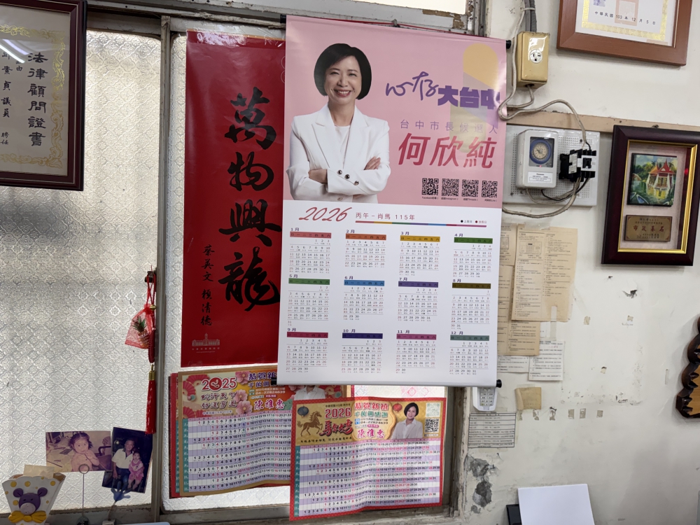 另一方面,民進黨台中市長參選人何欣純也推出約60×100公分的吊掛型年曆,版面大、字體清楚,適合張貼於客廳、店面或辦公空間。年曆以簡潔配色呈現全年日期與月份重點,兼顧實用與視覺辨識度,方便民眾快速掌握每日行程。