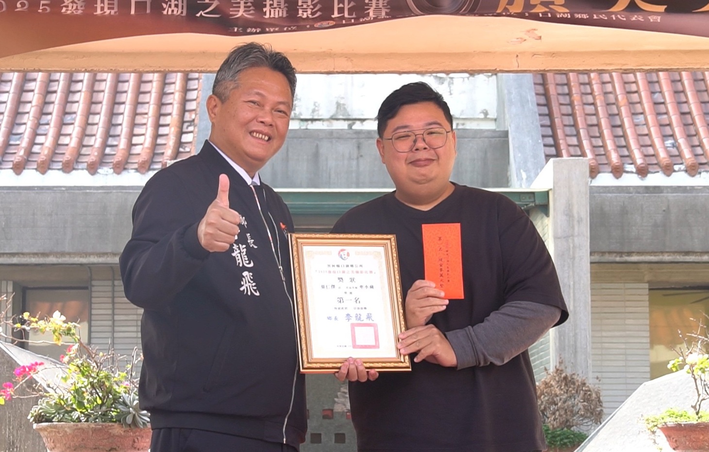 鄉長李龍飛親自頒發攝影比賽第2名得獎者李世豪,獲得獎狀及2萬元獎金。