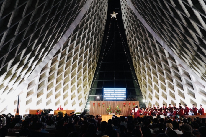 教堂內的子夜禮拜由主任牧師陳尚仁主持,以「為愛降生,有一嬰孩為我們而生」為題,透過莊嚴而寧靜的儀式,傳遞信仰的核心價值。與婦女會會長羅蕙蓮一起點亮蠟燭的張國恩校長表示,他和夫人希望每一位走進東海的人,都能在耶穌基督誕生的日子裡,感受到安定與祝福,帶著平安與盼望迎向新的一年。
