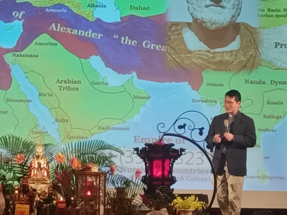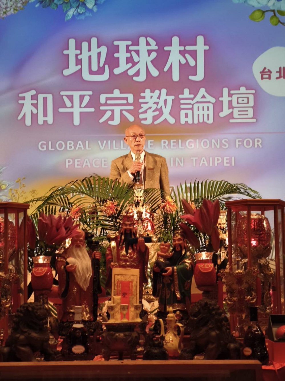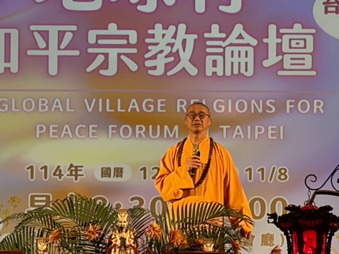(本報記者/胡真語台北報導)由玉靈千手觀音院謝玉慧老師出錢出力爲天地六道努力.今天在台北圓山飯店十二樓舉行各教派論壇.謝玉慧開埸,天主教林之鼎神父.佛教法藏法師.陳清秀教授.菊元宗白聖.一貫道謝簡.標雅純.理教執行長胡文中博士等人參加論壇。 菊元宗掌門白聖 天主教林之鼎神父 地球村和平宗教論壇北元開03 法藏和尚