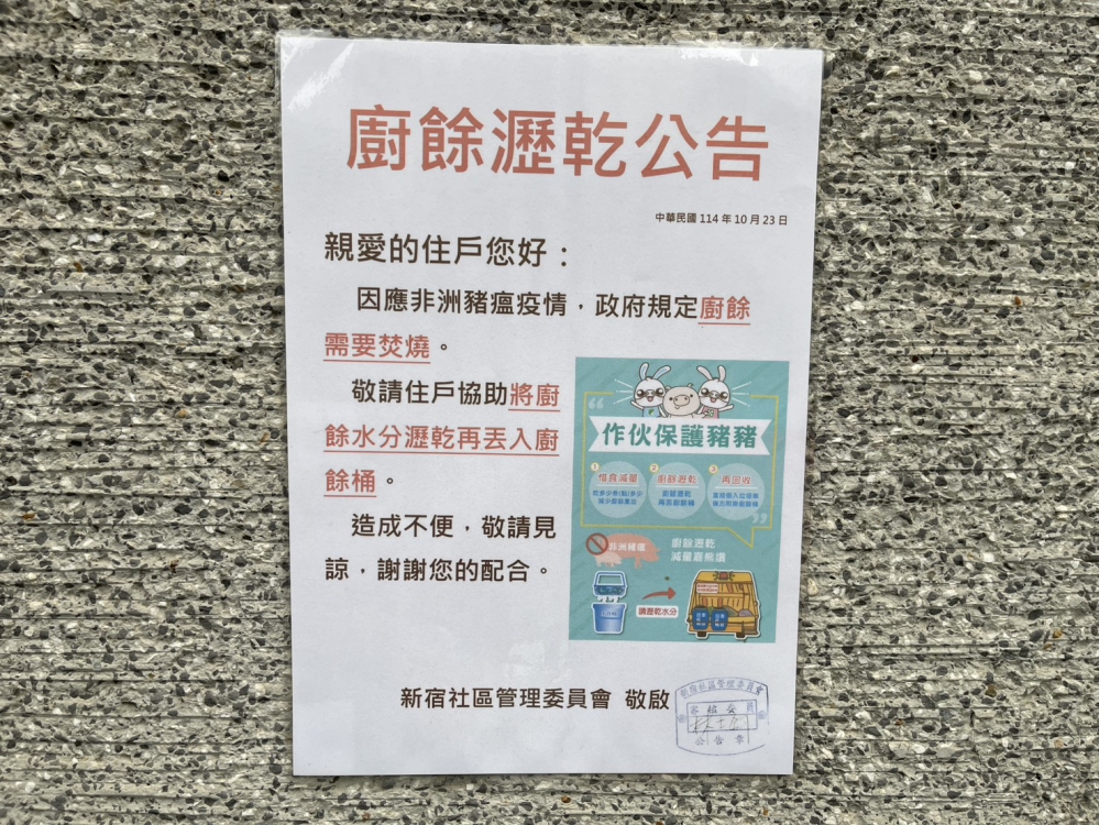 環保局也舉例說明,南屯區永春東路的新宿社區(143戶),原本廚餘委由養豬場清運,每月費用為1500元,在政策轉向後,經清潔隊到場輔導與詳細說明,順利改由環保公司將廚餘併一般垃圾清運,每月僅增加1000元費用,即完成收運模式調整。