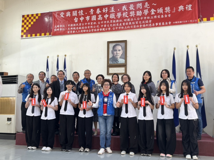【記者林獻元台中報導】 為關懷並鼓勵弱勢學子安心向學,臺中市民眾服務社於4(日)上午9時至12時30分在國民黨臺中市黨部三樓大禮堂,舉辦「愛與關懷・青春好漾・我最閃亮」臺中市立國中暨高中職學校品學兼優獎助學金頒獎典禮,以實際行動支持清寒學子追逐夢想。