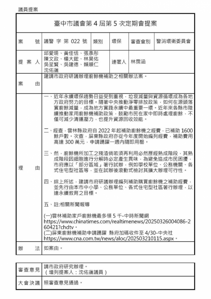 邱愛珊強調,廚餘機補助不僅能有效降低垃圾量與清運壓力,更是落實資源循環、減少廚餘外流風險的重要關鍵。面對申請踴躍的實際情況,她呼籲市府應及早評估追加經費、擴大補助名額,讓更多市民受惠,也讓這項政策真正發揮環境治理與防疫的雙重效益。