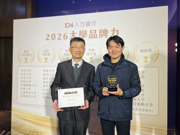 104人力銀行主辦的《大學品牌力》7日公布獲獎名單並於台北W Hotel舉行頒獎典禮,東海大學於120多所大學競逐中,奪下「最佳學群獎-建築與設計領域」私校第一、「地區領航獎-中部一般大學第三名」雙獎殊榮。104評比顯示,東海在學群聘僱力、學術聲望、國際力、研發力、高階領導力等多項企業重視指標中表現亮眼,整體成績獲高度肯定。