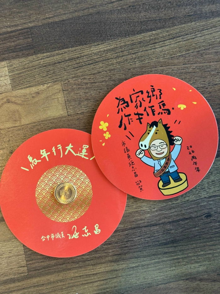 除了路口醒目的大型看板,施志昌也同步推出「一元開運小紅包」。紅包外型採圓形設計,不僅象徵「圓滿」,內嵌的一元硬幣更寓意「一元復始、萬象更新」。紅包背面印有「馬年行大運」的祝福,並標註「2026丙午年」,極具收藏價值。