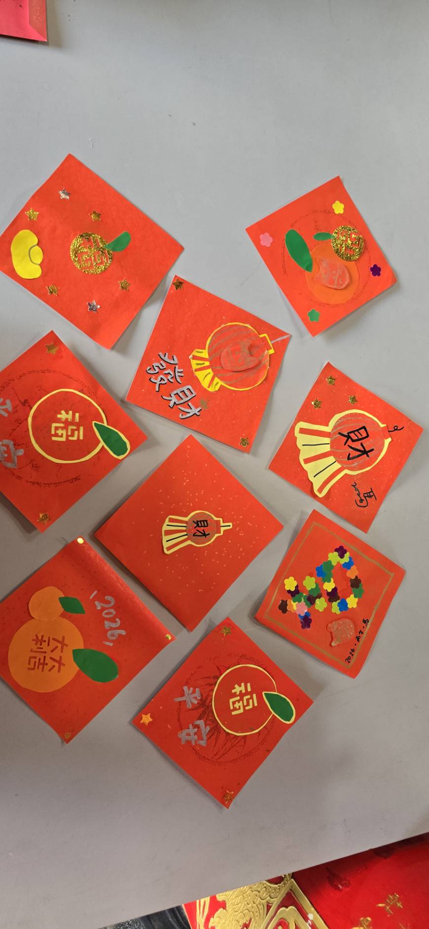 春節將至、暖意先行、台中市后里區后里國民小學二年三班同學在賴老師帶領下、開展「手作吉祥迎新春」小方斗社區贈送活動、全班同學親手設計、裁剪、黏貼、每人完成4張獨具巧思的吉祥小方斗、圖案涵蓋「財」「福」「大吉大利」「如意」等傳統年節祝福、融合傳統紋樣與童趣筆觸每張皆附手寫祝福語、創作字體、色彩鮮豔、部分更融入生肖2026馬元素與在地意象、展現童心與文化傳承。