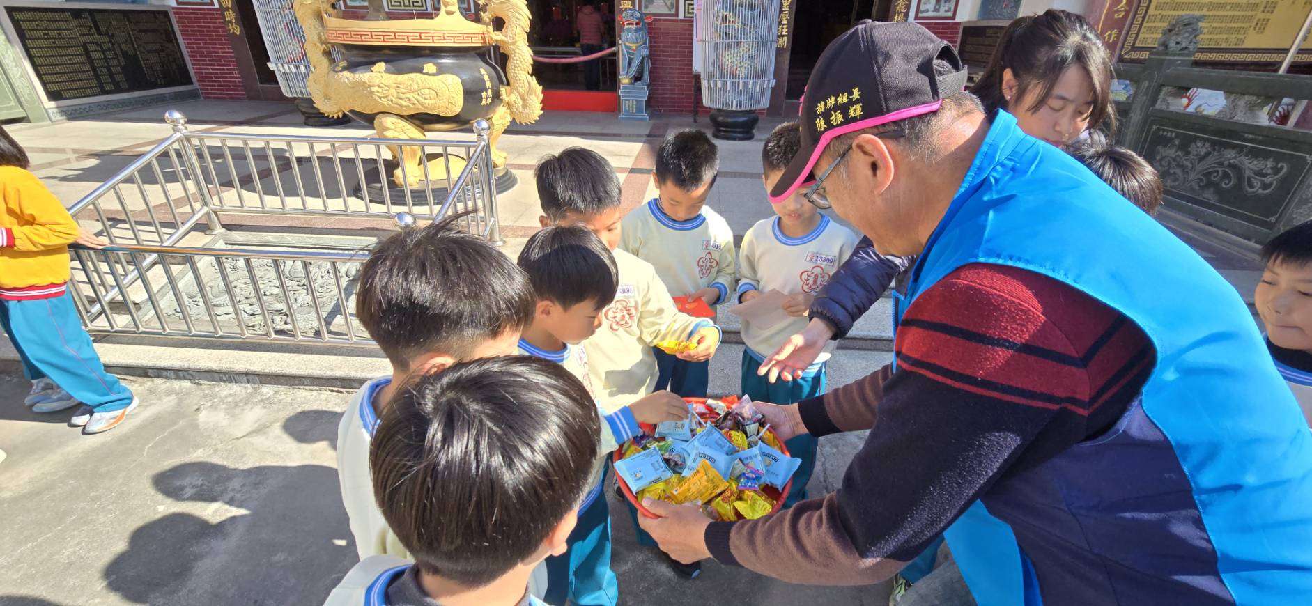 1月20日下午、師生攜手將近百張手作小方斗、於后里區熱鬧的后義宮前廣場舉行暖心活動、免費贈送社區民眾、現場歡聲不斷、一位領到「福」字方斗的銀髮阿嬤笑說:「孩子寫的字比春聯還暖心」賴老師表示此活動:「不只學習了解節慶文化、更希望孩子理解『分享』就是最好的年味。」