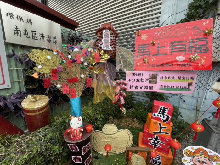 【記者林獻元台中報導】迎接馬年新氣象,台中市政府環境保護局南屯區清潔隊發揮巧思,在永春東路隊部門口打造充滿創意的春節裝置藝術「馬上幸福」。清潔隊員化身藝術家,利用回收紙箱打造馬身,更具巧思地將舊牛仔褲與廢棄選舉布旗裁剪拼貼成飄逸的馬鬃,拼組出栩栩如生的駿馬,展現資源回收再利用的無限可能。配合新春造景,南屯區清潔隊1月30、31日和2月6、7日上午9時至12時,將舉辦「環保問答送好禮」活動,邀請民眾來觀賞答題拿好禮,共度綠色春節。