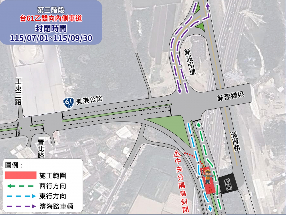 建設局表示,第二階段交通管制將封閉台61乙東行線(往和美方向),並改道至西行線,原雙車道將調整為「雙向各一車道通行」,濱海路(國道三號橋下路段)亦同步封閉。
