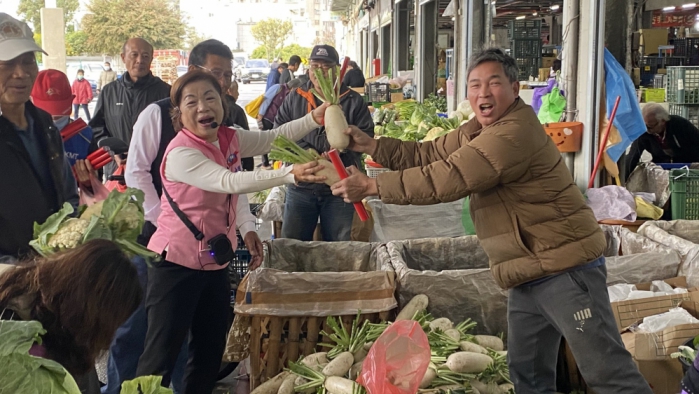 攤商們熱情回應「凍蒜、凍蒜!」,還有人送上菜頭、青蒜等表達支持。攤商也把握機會向楊瓊瓔反映菜價波動、物流成本上升及人力短缺等實務問題,並期待政府持續協助改善市場設施。