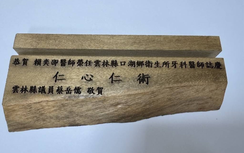 為表達歡迎之意,蔡岳儒也致贈賴醫師一個木雕名片座,方便鄉親索取名片與診療時間資訊,象徵地方對新任牙醫師的溫暖迎接。蔡岳儒強調,未來將持續關注並努力推動偏鄉醫療資源的完善,讓口湖鄉親能在地獲得更完整、便利的醫療照護。