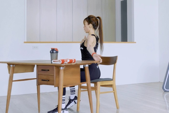 3、前側肌肉伸展:坐姿保持挺胸、下巴微收,雙手向後抓住椅緣或桌邊,手臂自然伸直或微彎都可以,依肩關節舒適度調整。接著以「胸口向上打開」為主軸,同步讓肩胛向後下方收回(後收、下壓),感受胸前與肩膀前側肌肉被撐開的張力;特別注意不要為了加深而讓腰椎過度前凸、肋骨外翻。