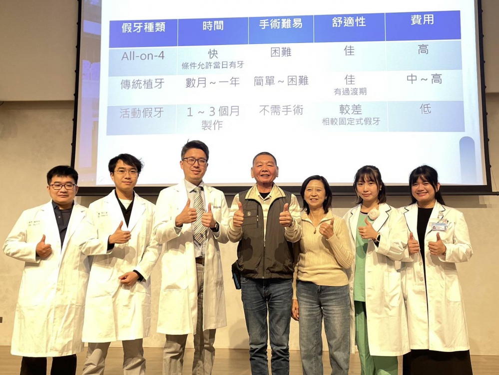 中醫大市醫表示,院內引進3D電腦導航系統進行All-on-4植牙手術,能精準規劃植體位置與角度,搭配客製化固定式臨時假牙,多數患者於手術後即可恢復基本咀嚼功能,有助縮短治療時程並提升治療穩定性。牙醫部由7位專科醫師組成,涵蓋多項牙科次專科,採跨科整合照護模式,確保患者從術前評估、手術至假牙重建皆能獲得完整醫療服務。