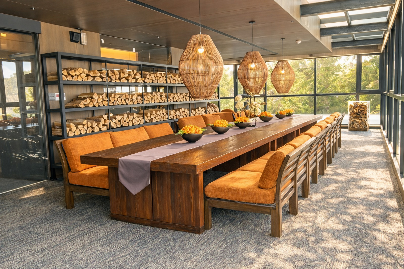 阿里山賓館頂級客房交誼廳的沙發設計揉和木質與溫柔暖色系的愛馬仕橘風格。(圖/ 阿里山賓館提供)