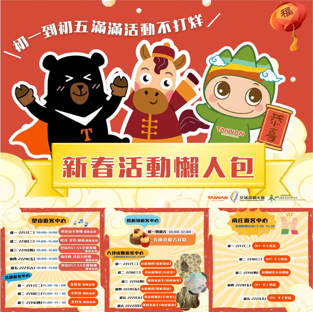 參山處六大遊客中心於春節期間每日08時30分至17時30分對外開放,歡迎民眾多加利用台灣好行大眾運輸,享受輕鬆、低碳且充滿文化底蘊的春節假期。更多活動資訊,請上參山國家風景區管理處官網或臉書粉絲專頁查詢。