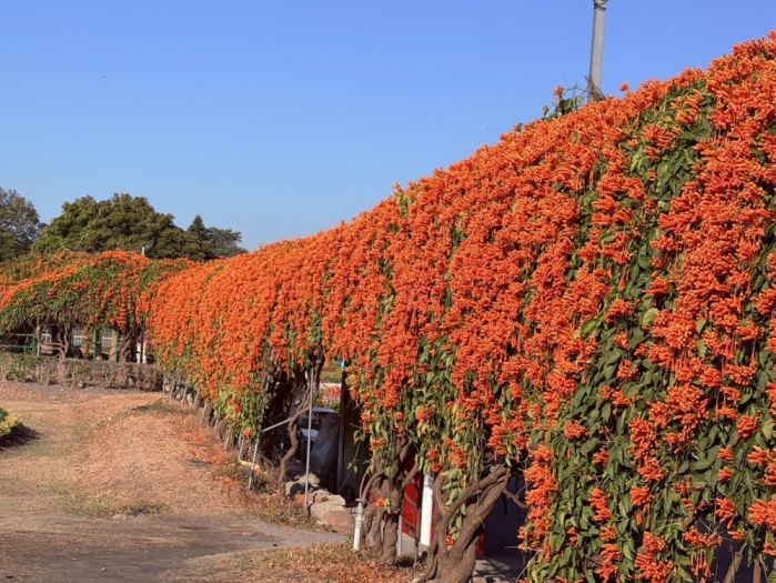 另外,中社觀光花市八公頃餘的花園中有百合花、鬱金香、彩色海芋、彩色非洲菊、向日葵花、一串紅、紫色鼠尾草、麥桿菊,最讓遊客有新看頭的是海區橙色花瀑布─炮仗花花牆應景大爆開,成為遊客過年賞花打卡最佳去處。