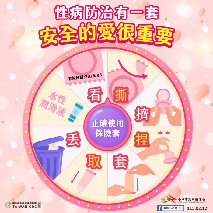 【記者林獻元台中報導】西洋情人節適逢春節連假,伴侶間約會與親密互動增加。台中市政府衛生局提醒,愛滋病毒(HIV)、梅毒及淋病等性傳染病感染不限特定性別或性傾向,只要未落實安全性行為,皆有感染風險。為守護自己與伴侶健康,應正確使用保險套並定期篩檢,讓愛更安心、更長久。