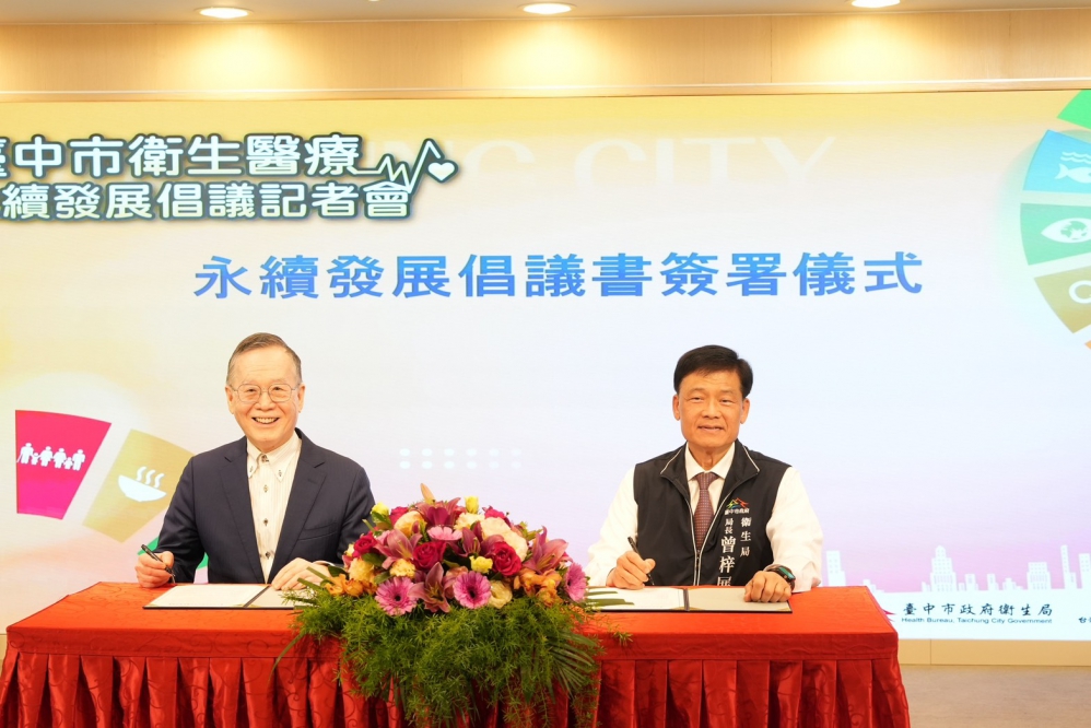 【記者林獻元台中報導】台中市政府衛生局13日舉行「台中市衛生醫療永續發展倡議記者會」,由市府秘書長黃崇典擔任見證人,並由衛生局長曾梓展與台灣永續能源研究基金會董事長簡又新共同簽署永續發展倡議書。