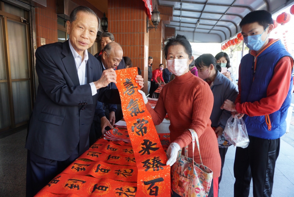 董事長的初中同學、萬和宮書法班老師張茂樹,每年都很熱心支持這項活動,今年仍然與學員一起揮毫,寫了數百幅春聯及「大家恭喜」、「春」、「滿」「招財進寶」等吉祥字。