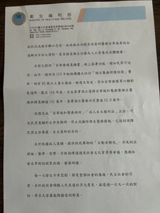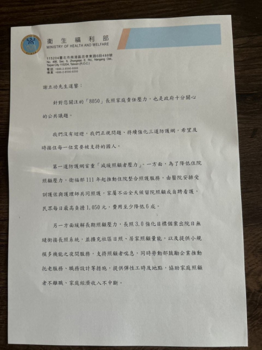 日前收到衛生福利部針對「8050」長照家庭壓力及「善終權」議題的回覆,本人對政府願意正視高齡社會下的民生痛點,衛生福利部也積極回信,表達誠摯的肯定。