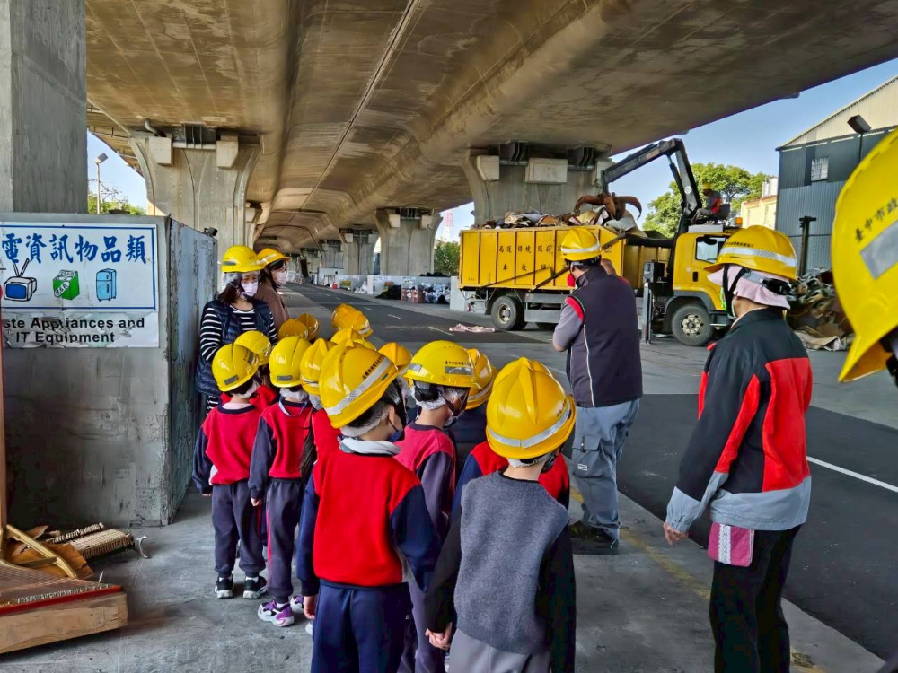 環保局分享,活動中孩子們穿戴整齊、戴上安全帽,在老師、環保志工、現場工作人員的帶領下,有秩序地走進回收場參觀。孩子們親眼看到垃圾車、資源回收車、抓斗車等大型設備如何協助分類與處理廢棄物,個個睜大眼睛、充滿好奇,紛紛發問:「這些瓶瓶罐罐真的可以變成新東西嗎?」