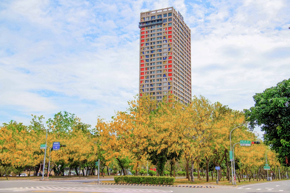 酒店步行至世賢路綠園道只需5秒鐘,黃金阿勃勒5月盛開隨時都能前往。(圖/嘉義福容voco酒店提供)到了冬季,嘉義大學民雄校區波斯菊花海與玉山路美人樹接力綻放,粉紅花景為城市增添溫柔氛圍,同時搭配年度花海生活節活動,吸引眾多旅人前來造訪,為全年賞花旅程畫下完美句點。
