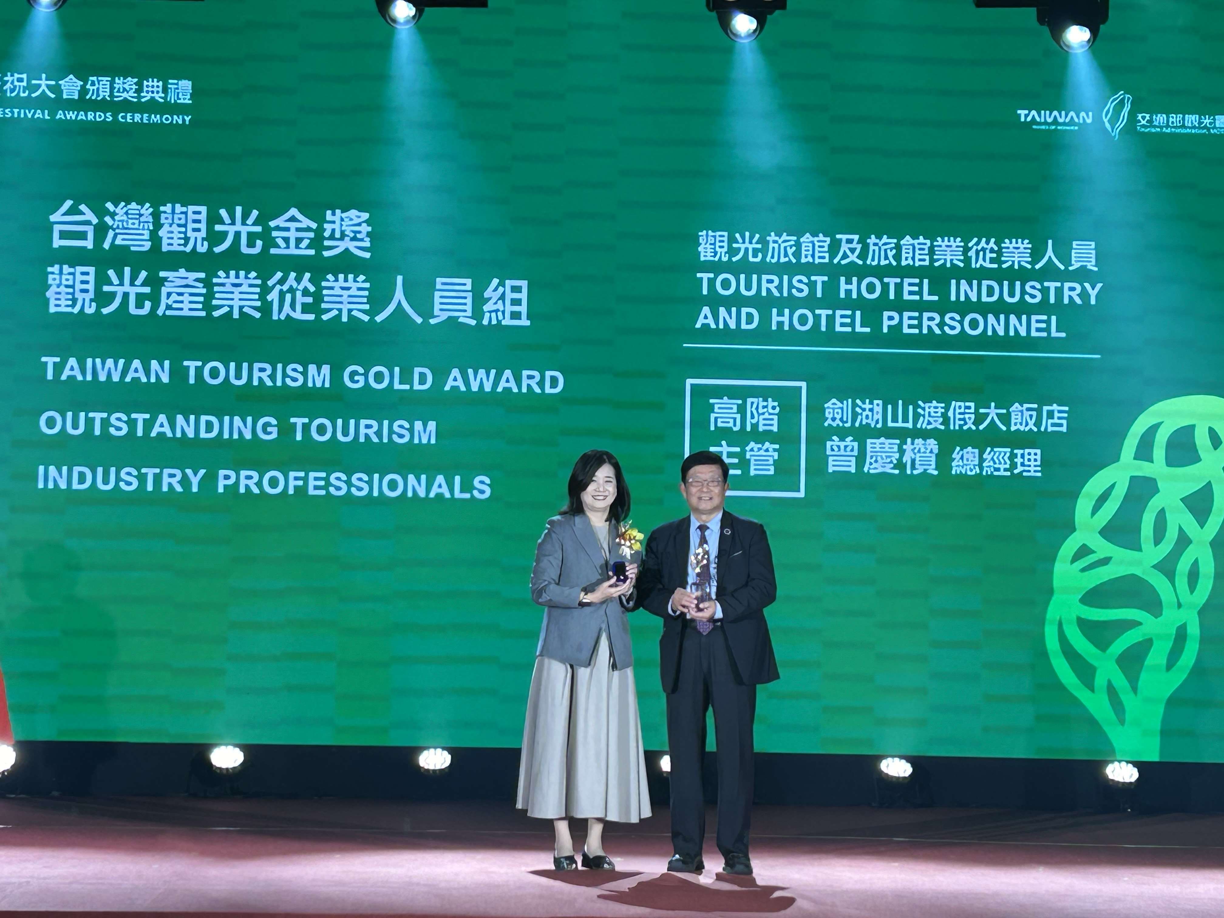 此外,劍湖山世界憑藉穩定營運品質與良好顧客滿意度,在觀光署年度督導考核中再次獲得「特優等」肯定。劍湖山渡假大飯店總經理曾慶欑則因長期深耕觀光產業,榮獲「台灣觀光金獎」,成為觀光界的最高榮譽之一。