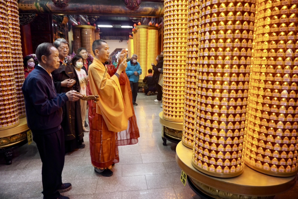 接著,由彰化朝天堂普銓法師開懺,偕同蕭董事長及董事張俊鎮到斗燈、太歲殿、光明燈、文昌燈殿灑淨及點燈;誦經團則持續誦經祈福,莊嚴肅穆。