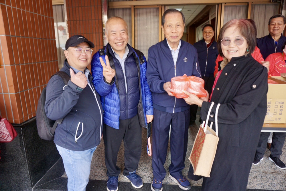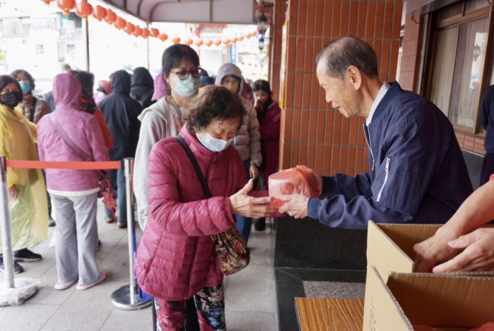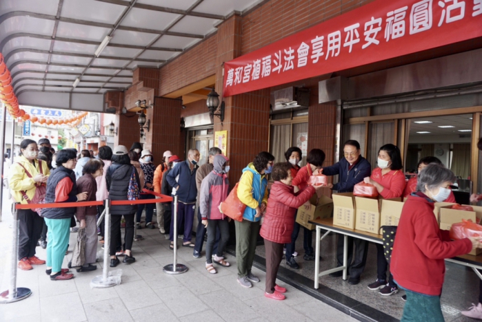 將近8點就有信眾排隊等候,領取湯圓及壽麵時,董事長蕭清杰和他們親切互動,「祝福大家平安!」「呷平安!」「謝謝!」「萬和宮的湯圓及平安夀麵,都很好吃!」其餘董監事,也給信眾們獻上最大的祝福,互動熱絡。